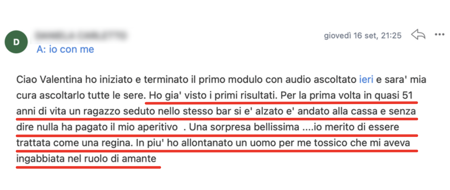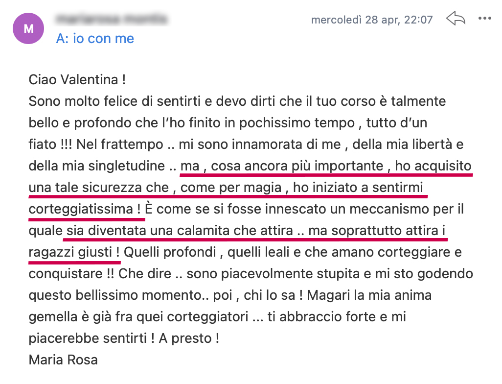 Attraverso ioconme.com, i miei programmi e i percorsi di mentoring individuali ho aiutato centinaia di donne a trasformare il loro modo di pensare e vedere se stesse, in particolare quando si tratta di vivere con sofferenza il proprio status di donna single.