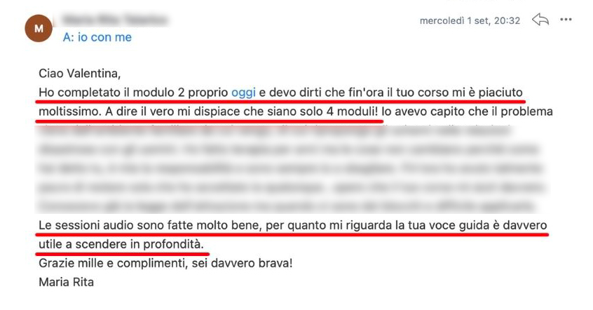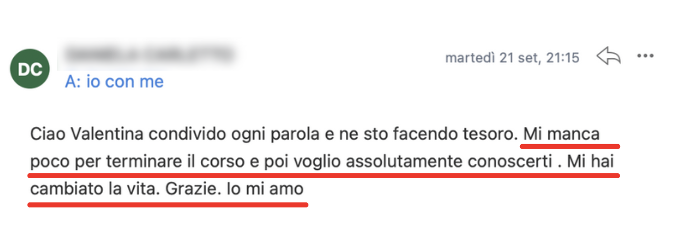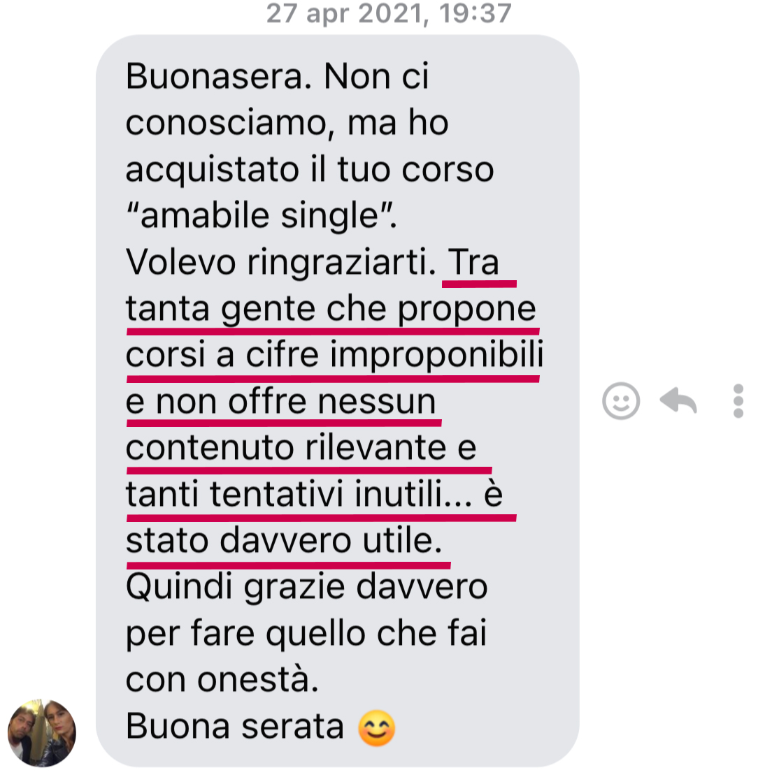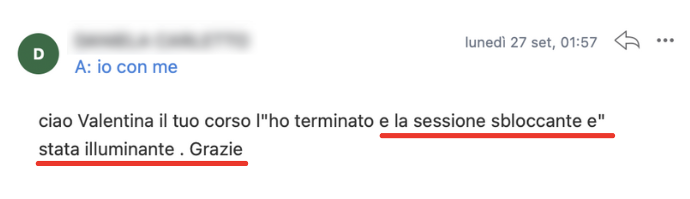 Questo significa che, se facendo il corso ti renderai conto che le informazioni al suo interno non fanno per te o non ti sono utili, potrai entro il quindicesimo giorno dalla data di acquisto richiedere il rimborso completo scrivendoci una mail senza dover dare alcuna spiegazione... e rimarremo comunque amiche come prima.