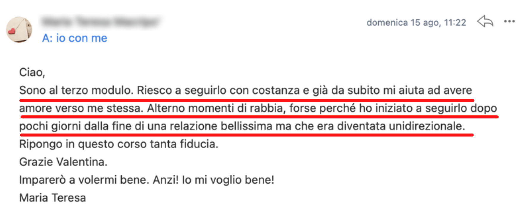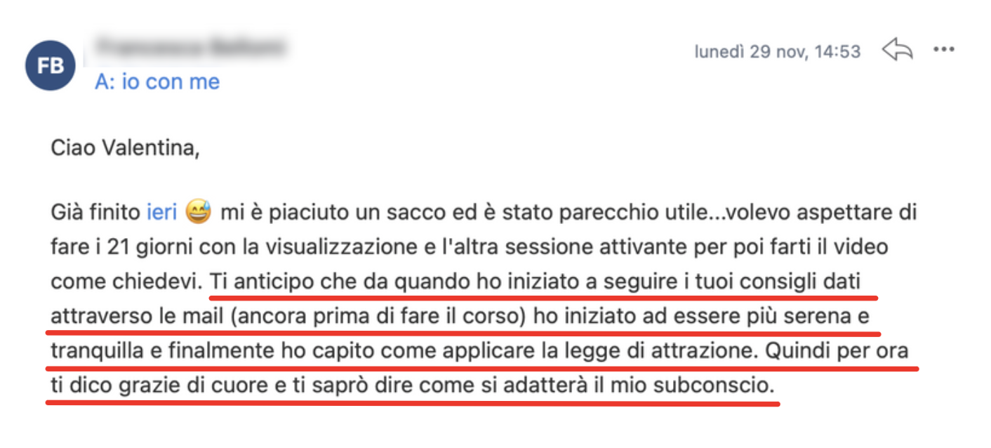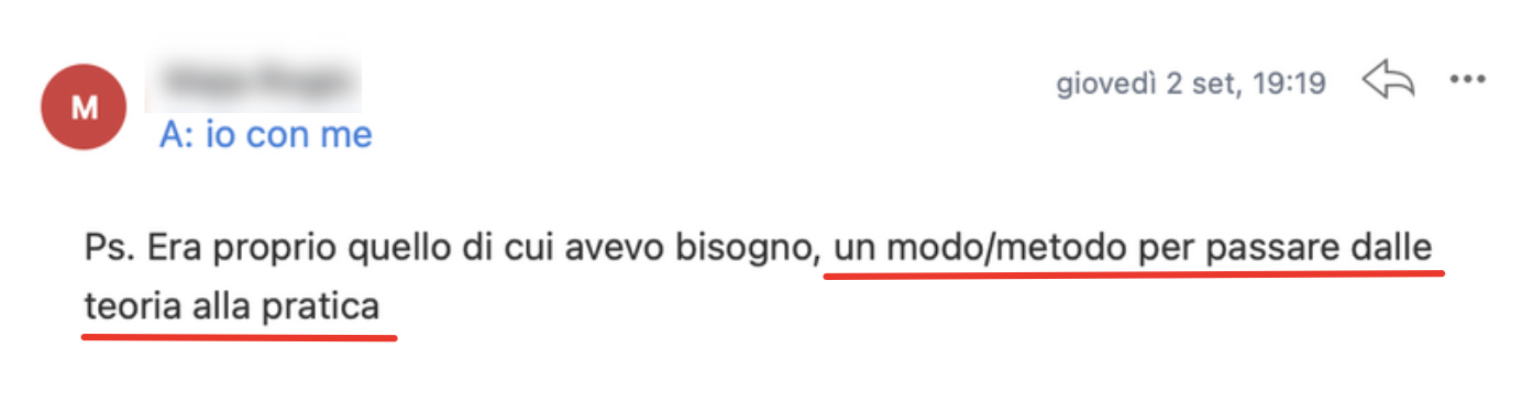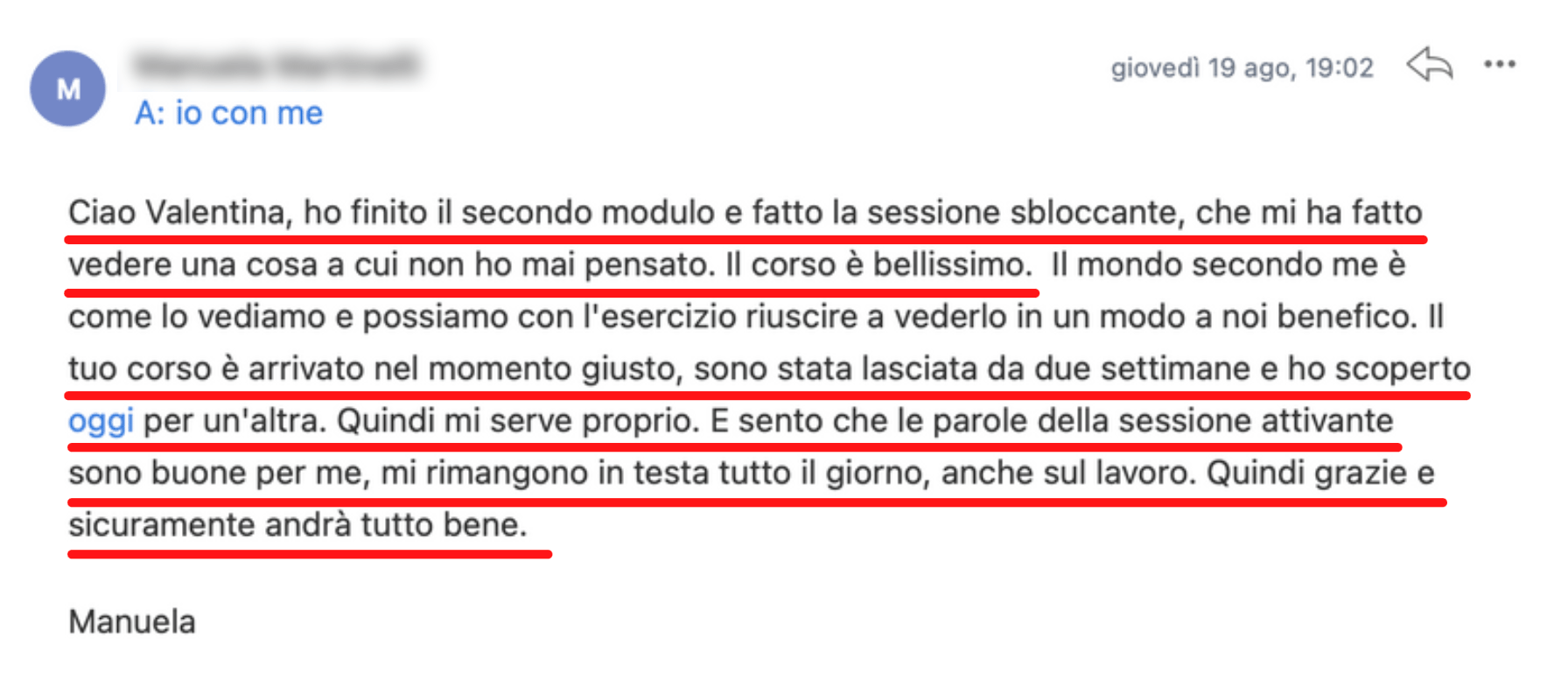 Questo significa che, se facendo il corso ti renderai conto che le informazioni al suo interno non fanno per te o non ti sono utili, potrai entro il quindicesimo giorno dalla data di acquisto richiedere il rimborso completo scrivendoci una mail senza dover dare alcuna spiegazione... e rimarremo comunque amiche come prima.